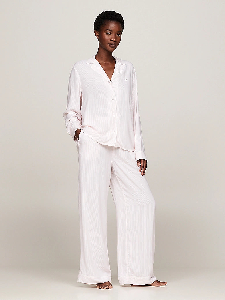 Tommy Hilfiger pyjama bottoms in pearly pink, featuring white pinstripes and an adjustable string waistband.