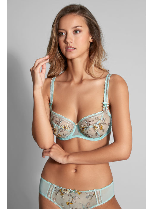 An explosion of flowers for this underwired demi-cup bra with all-over embroidered tulle on the cups. Thanks to the seams on the cups and Empreinte’s corset making expertise, it provides perfect lift. The straps covered in pretty patterned embroidery add to this special collection's “luxury” feel. The lovely old-style button gives the final touch to this “gem” of a bra. The green-turquoise glow colour of the Lauren design provides lavish and fresh detailing for the summer season.
