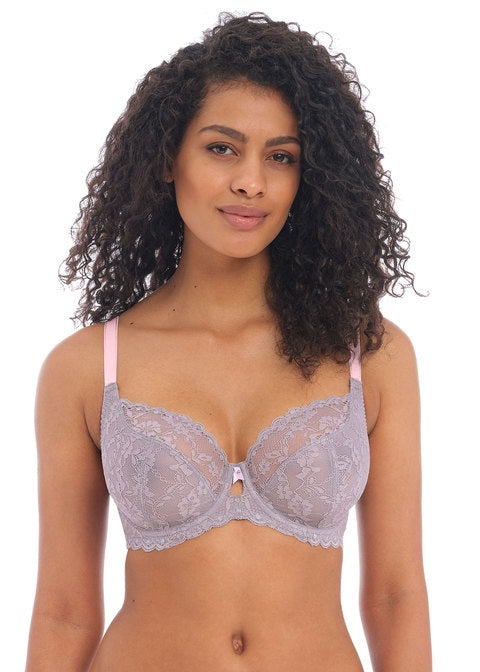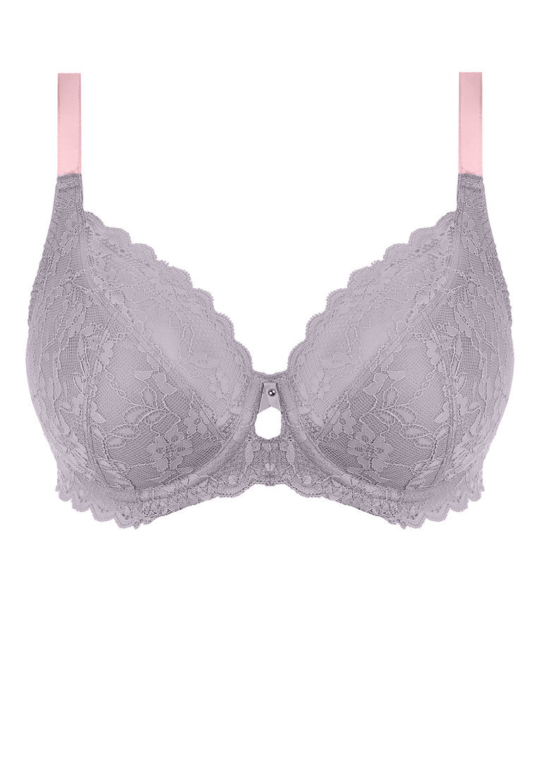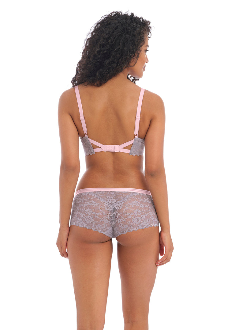 Freya favourite Offbeat is back for another season. All pieces are crafted from a stretch floral lace, and feature contrast colour detailing at the bra straps and the waistbands of the briefs. Look out for the collection’s new UW Plunge Bra too, which has a cut out centre front and a gated back design as seen in our much-loved Fancies collection. Available in Mineral Grey.