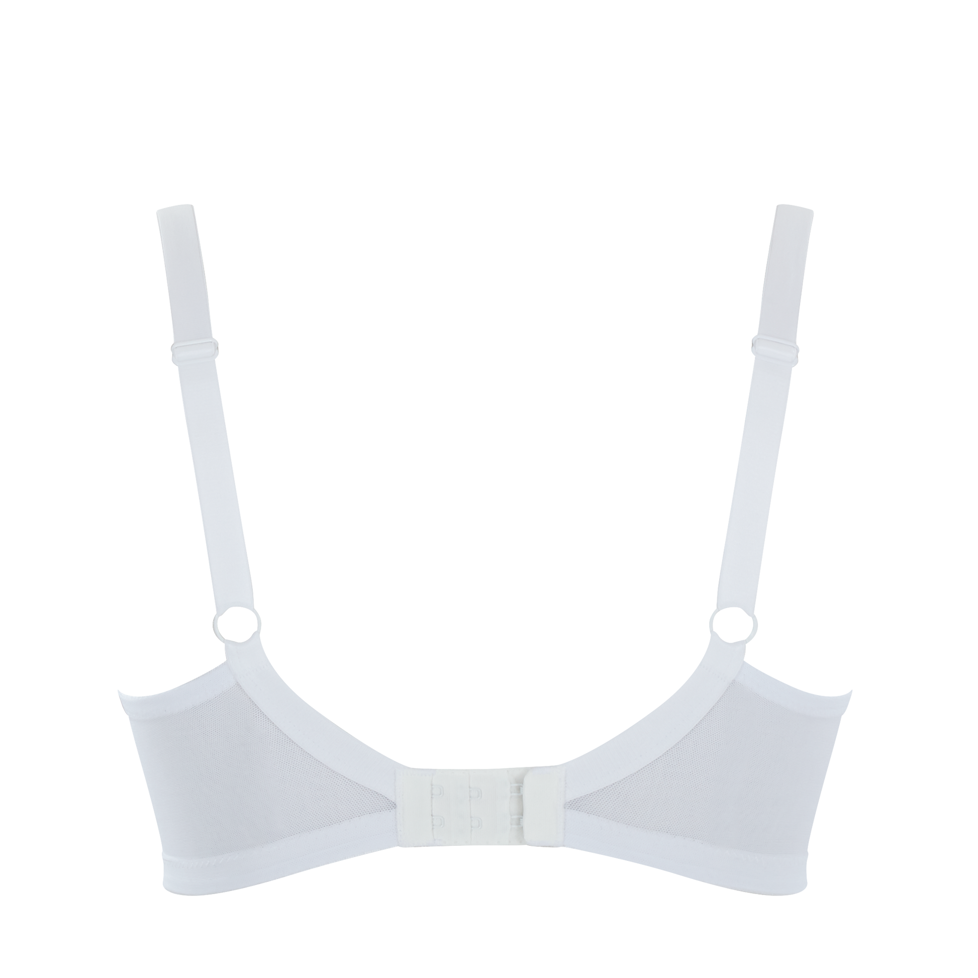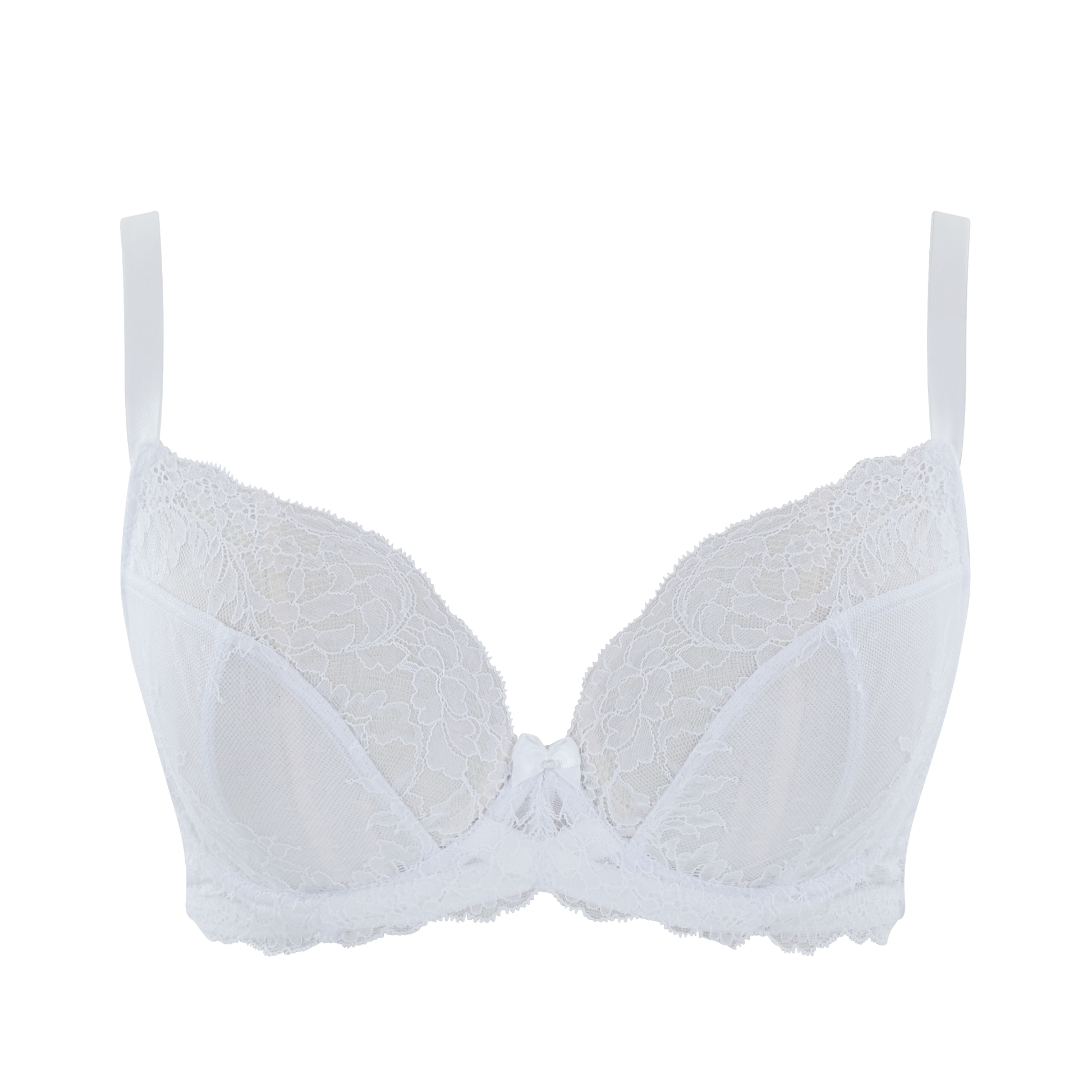 The Panache Ana Plunge bra in white has feminine stretch lace top cups, finished with a satin ribbon bow and beautiful bead detail. The stabiliser lined bottom cups and inner side sling provide comfortable relaxed support and an uplifted fit up to a H cup. Ana gives a sexy plunging neckline, perfect for slipping on underneath low-cut outfits!
