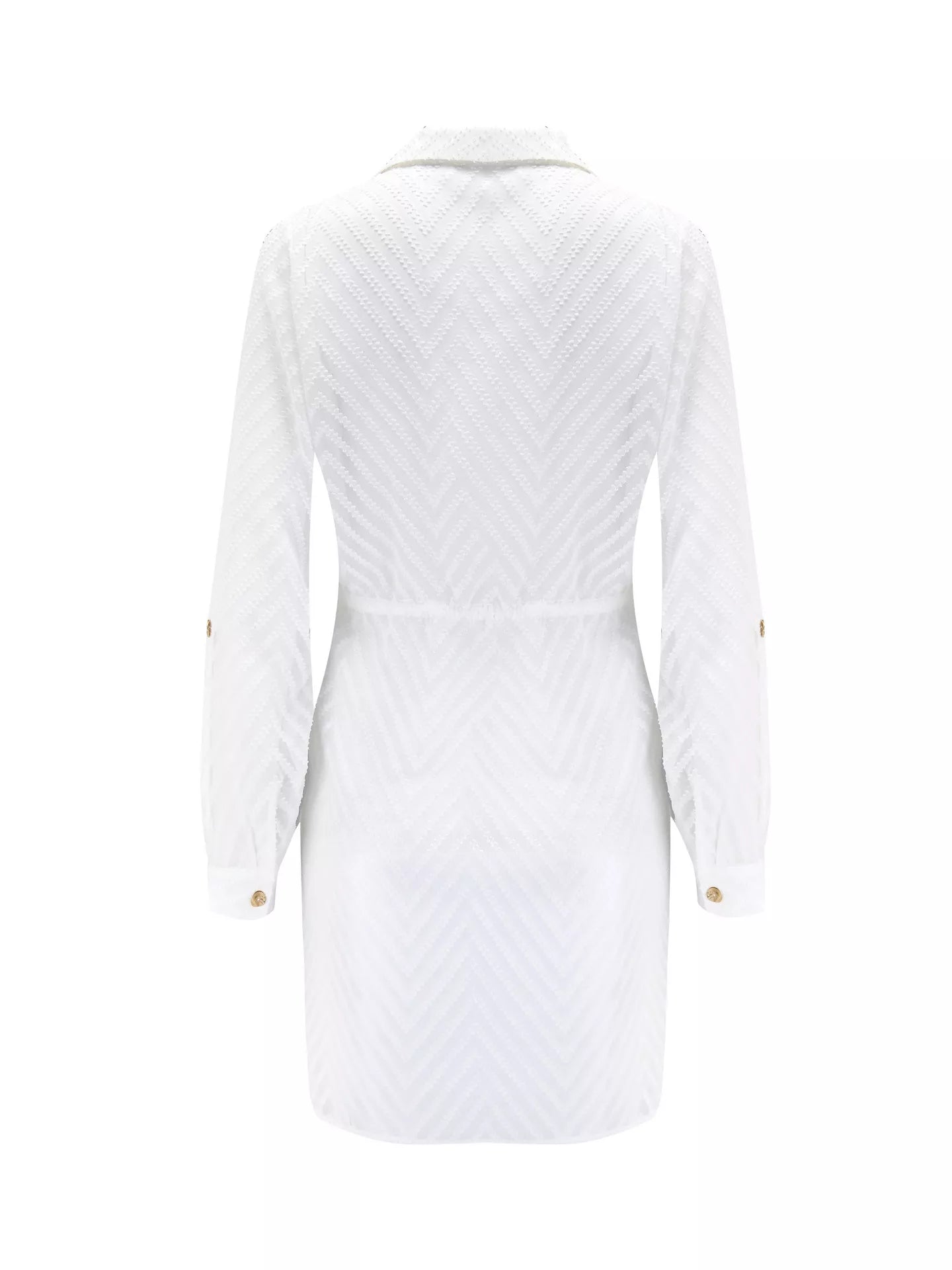 Enhance your beachwear look with the Chevron Stripe Button Through Beach Shirt. Made from a lightweight chiffon fabric, this shirt is designed to keep you cool and comfortable even in the hottest of days. With its button placket, this shirt is easy to put on and take off, making it perfect for a day at the beach or a casual outing. The functional tie waist closure adds a touch of versatility, allowing you to adjust the fit to your liking. You'll never have to worry about rolling up your sleeves again, as this beach shirt comes with adjustable sleeve tabs. Keep it long for added coverage or roll them up for a more relaxed and casual look. Its eye-catching chevron stripe print adds a chic finish to your beachwear look.